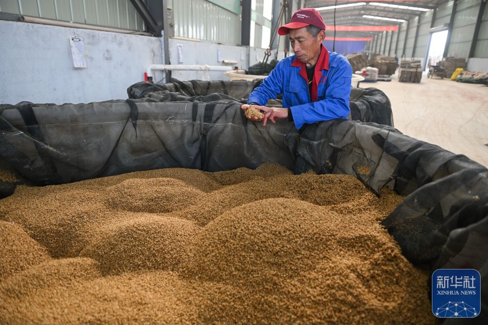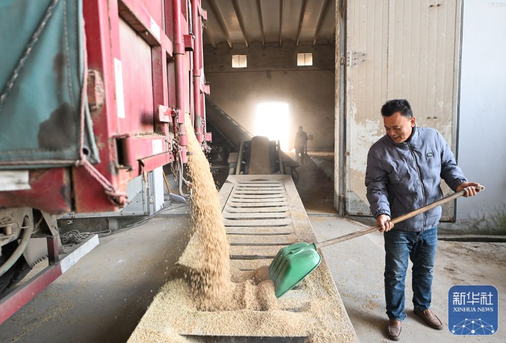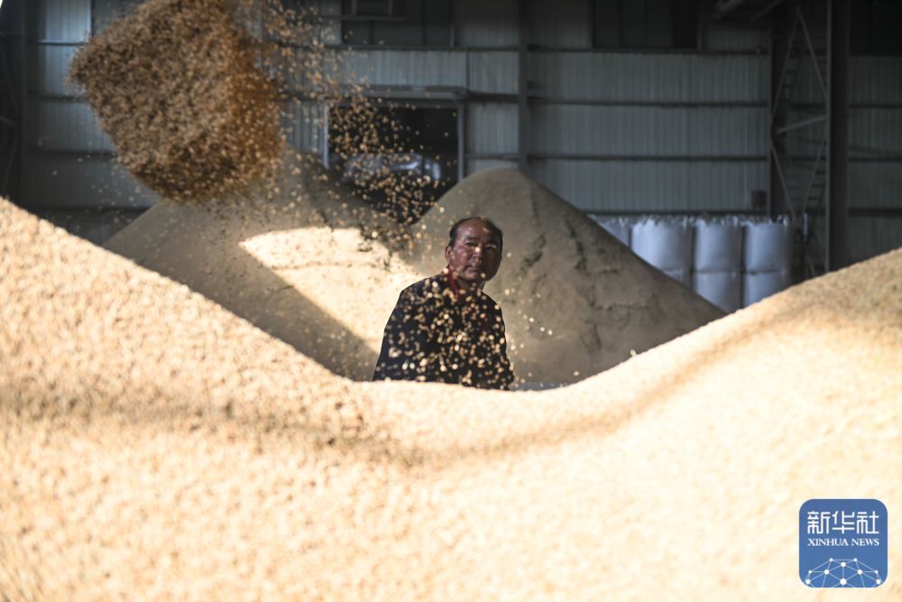在位于射陽縣的江蘇必新大米集團,工人在整理稻谷(10月30日攝)。