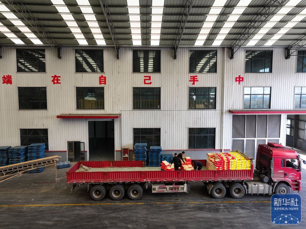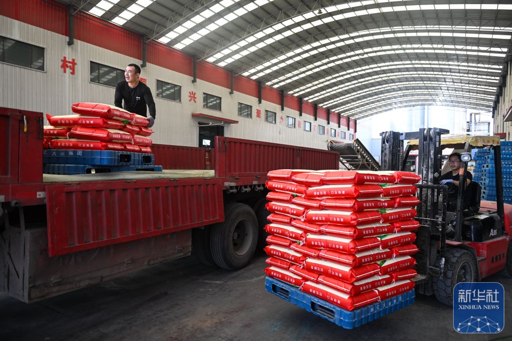在位于射陽縣的江蘇必新大米集團,工人往卡車上裝運射陽大米。(10月30日攝,無人機照片)