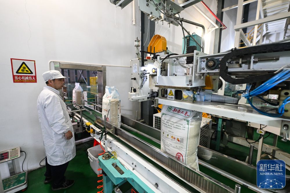 在江蘇射陽大米集團有限公司自動化生產車間,一袋袋射陽大米完成包裝。(10月29日攝)
