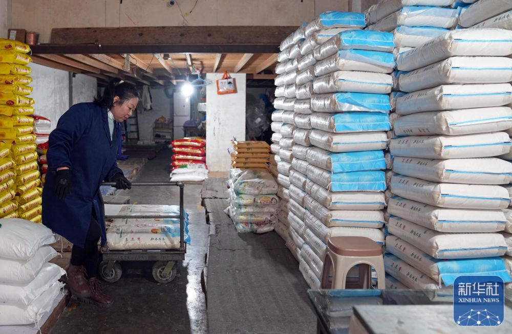 在上海市京江路上的秀蓮食品店,店主在搬運射陽大米。(11月11日攝)