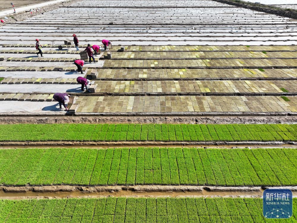 射陽縣為民農機合作社農民在秧池擺放秧盤。(5月8日攝,無人機照片)