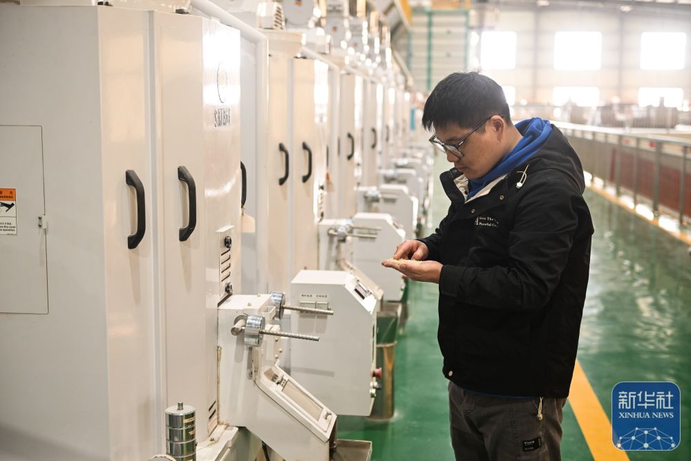 在位于射陽縣的江蘇必新大米集團,工人在檢查機器碾米情況。(10月30日攝)