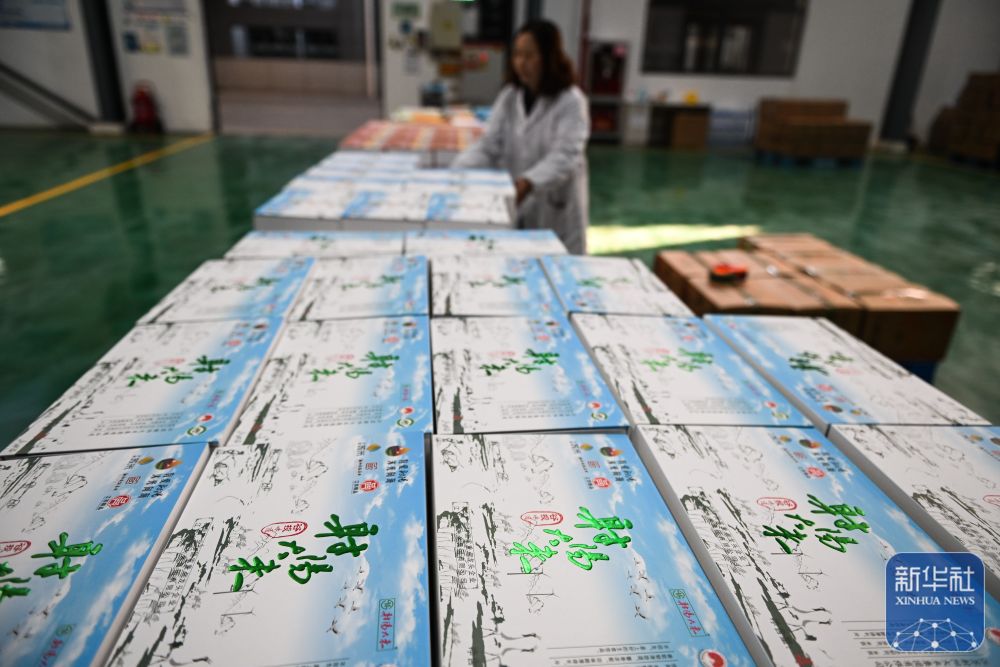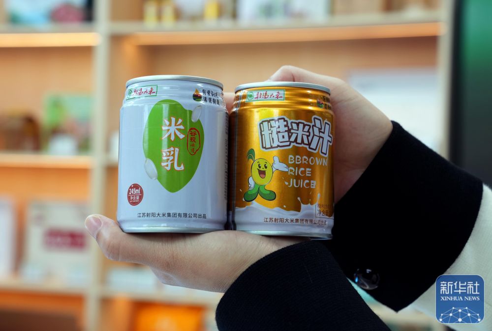 位于上海農產品中心批發市場的上海供銷市集江蘇優質農產品館中,工作人員展示用射陽大米加工制成的飲料。(11月11日攝)