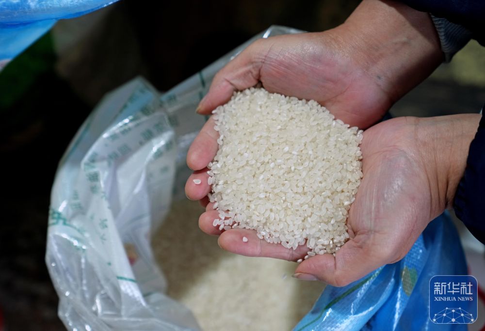 在上海市京江路上的秀蓮食品店,店主在展示店內售賣的射陽大米。(11月11日攝)