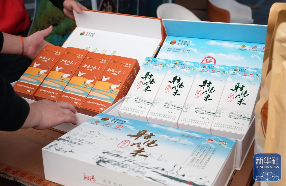 位于上海農產品中心批發市場的上海供銷市集江蘇優質農產品館中展示的優質射陽大米禮盒(11月11日攝)。