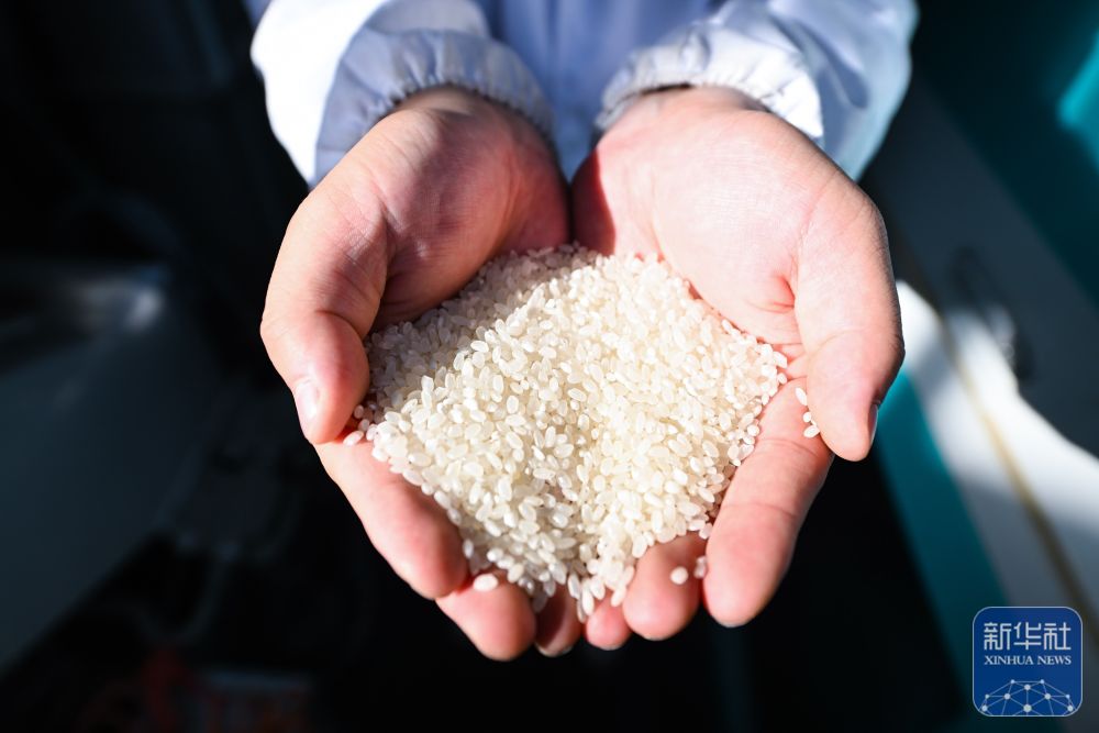 在江蘇射陽大米集團有限公司自動化生產車間,工作人員展示加工完成的大米。(10月29日攝)