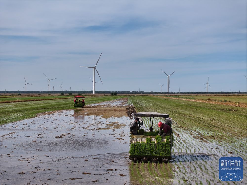 插秧機在射陽縣一塊水田作業(6月18日攝,無人機照片)。