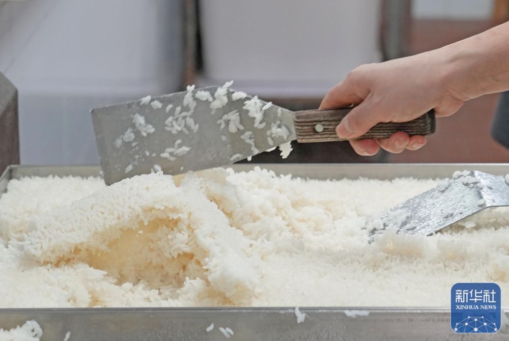 11月11日,在位于上海靜安區的一家單位食堂內,餐廚人員在切分用射陽大米蒸制的米飯。
