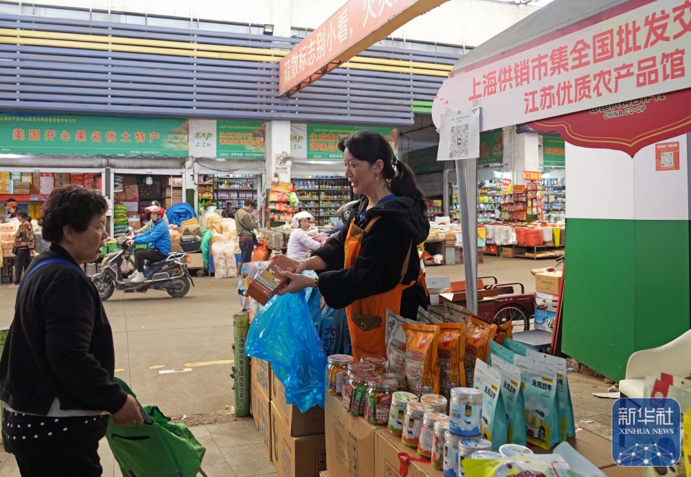 位于上海農產品中心批發市場的上海供銷市集江蘇優質農產品館外,工作人員向顧客推薦優質射陽大米(11月11日攝)。