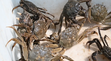 “好蟹不怕晚,膏滿肉甜時”?!傲⒍院?,也是一年當中蟹黃最肥的季節。目前塘里的公蟹基本上能達到4兩以上,母蟹3兩半左右?!睏顤|成一邊說,一邊將剛撈上來的螃蟹進行精挑細選、保質保量上市。