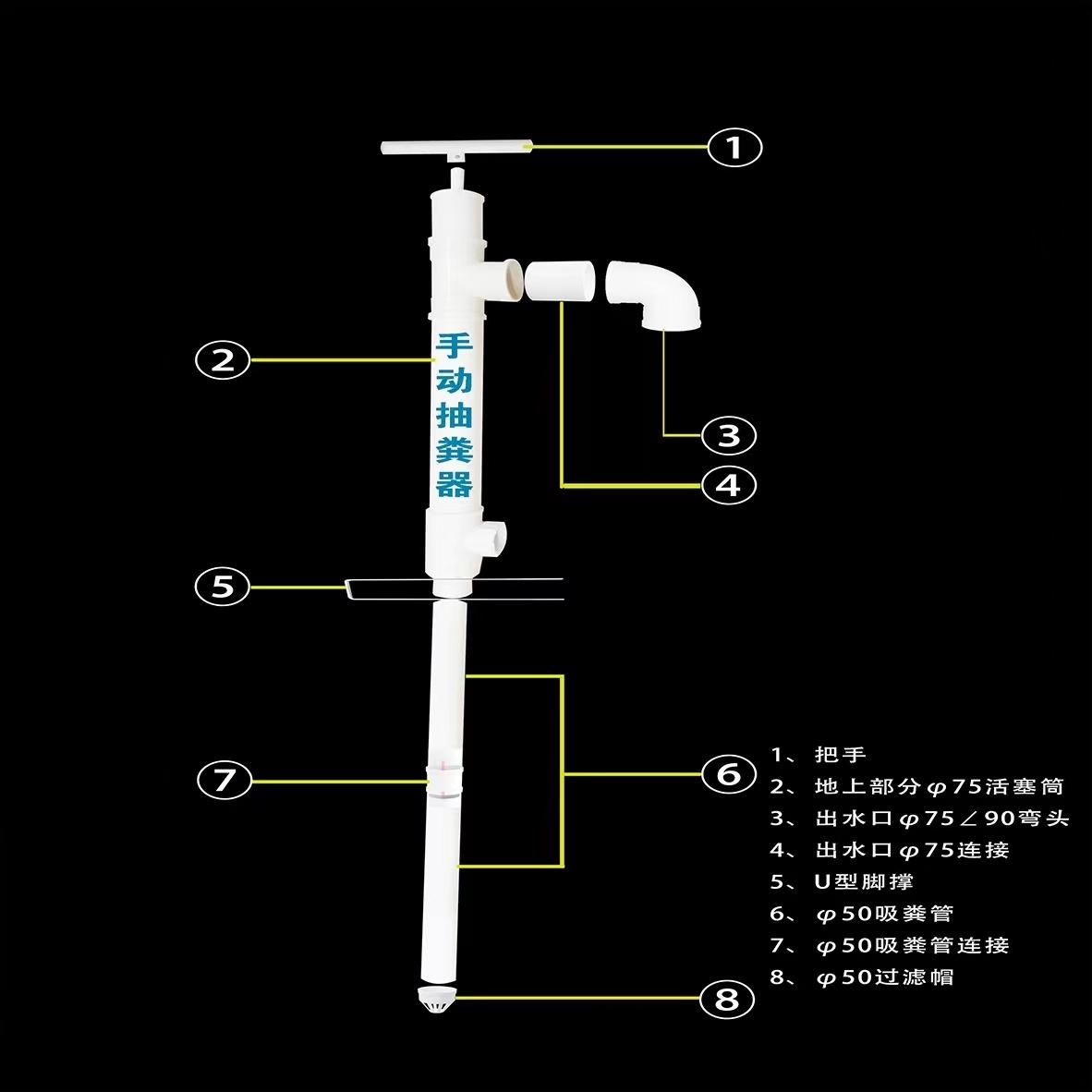 針對以上農村戶廁改造化糞池清掏管護的現實困境,泗陽縣農業農村局通過走訪農戶、化糞池生產企業、咨詢專家等多種渠道集思廣益,立足群眾路線,創新采用了手動抽糞器作為戶廁改造的配套設備,發放給改廁農戶使用。手動抽糞器由把手、活塞筒、出水彎頭、吸糞管、過濾帽等部分組成,材料全部采用工程塑料,不生銹,耐腐蝕,易清洗。手動抽糞器活塞單次行程可排出2-3升污水,每分鐘可排出120升左右污水,5-8分鐘即可清空三格式化糞池第三格,整個化糞池全部清空需要10-15分鐘左右,清掏效率較高。手動抽糞器使用場景較廣,操作簡單,易學易用,使用率高。