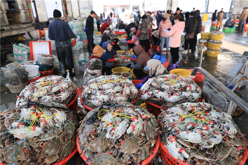 新年伊始,沿海冬捕梭子蟹喜獲豐收。連云港市贛榆區海頭鎮海產品交易市場,漁民在分揀捕獲的鮮活梭子蟹。 當地漁業碼頭每天捕獲上岸的梭子蟹約20萬公斤,漁民將鮮活梭子蟹分揀裝筐,除滿足本地市場供應外,大部分銷往北京、上海、廣州等地。(王玥 司偉 徐靜)