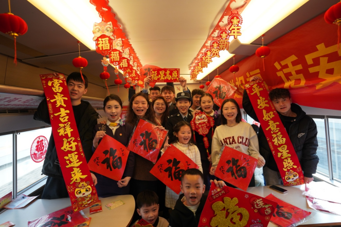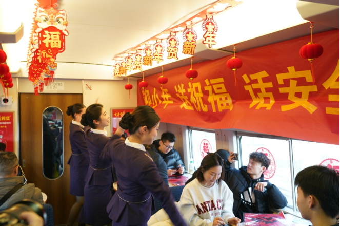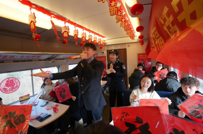 活動尾聲,列車乘務人員為旅客送上精心準備的祝??ㄆc春聯、福字等。春聯墨香四溢,承載著對旅客的美好祝愿,為旅途增添濃郁年味。