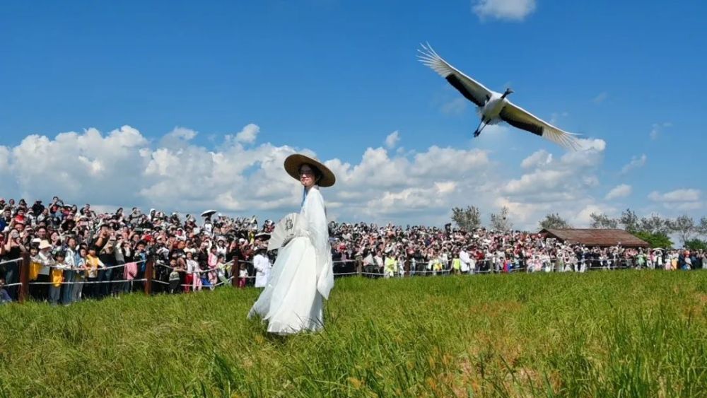 在丹頂鶴濕地生態旅游區,游客們有幸目睹了丹頂鶴的野化訓練過程,其展翅飛翔、翩翩起舞的優雅身姿讓游客們贊嘆不已。
