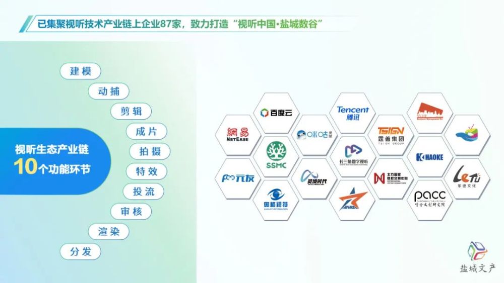 依托鹽城數字經濟強引擎和算力強基礎,打造長三角(鹽城)數字視聽產業基地,為數字文化人才提供創新創業空間,已集聚視聽技術產業鏈上企業87家,形成集建模、拍攝、剪輯、投流等功能于一體的視聽生態全產業鏈,致力打造“視聽中國·鹽城數谷”。