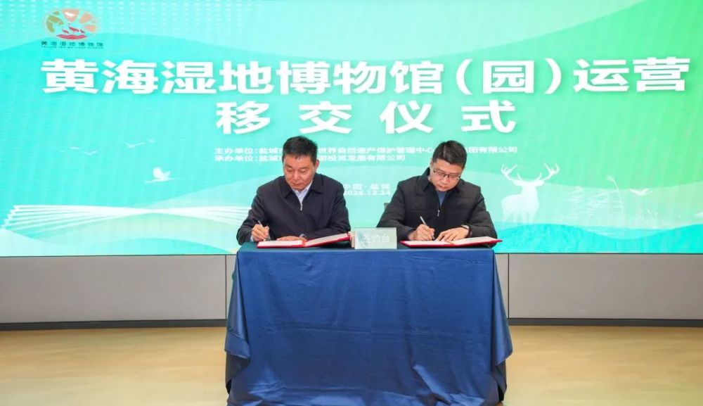 交接儀式共三項議程。首先由鹽城市濕地和世界自然遺產保護管理中心副主任曹雷與燕舞集團黨委委員、副總經理潘曉就黃海濕地博物館(園)人員花名冊進行移交簽約。緊接著,鹽城市濕地和自然遺產保護管理中心主任吳其江,燕舞集團黨委書記、董事長樊榮共同為鹽城黃海濕地博物館運營有限公司揭牌。最后,參會嘉賓一同參觀黃海濕地博物館(園)。
