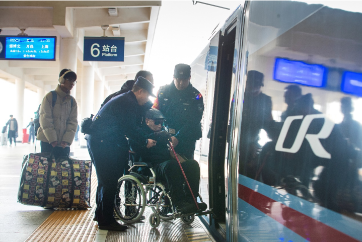 民警在幫助出行困難的旅客乘車。趙啟瑞 攝