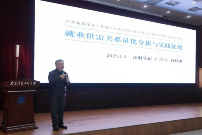 江蘇省高校招生就業指導服務中心六級職員、黨總支委員蔣晨陽作《就業供需關系量化分析與實踐優化》主題報告。報告圍繞高等學科專業結構調整優化改革與促進高質量充分就業展開,從數量、質量、結構、周期等方面深入分析了高校教育與就業市場的供需關系。他指出,高校需緊跟就業市場的變化趨勢,適時調整學科專業設置,以實現與就業市場的精準適配。