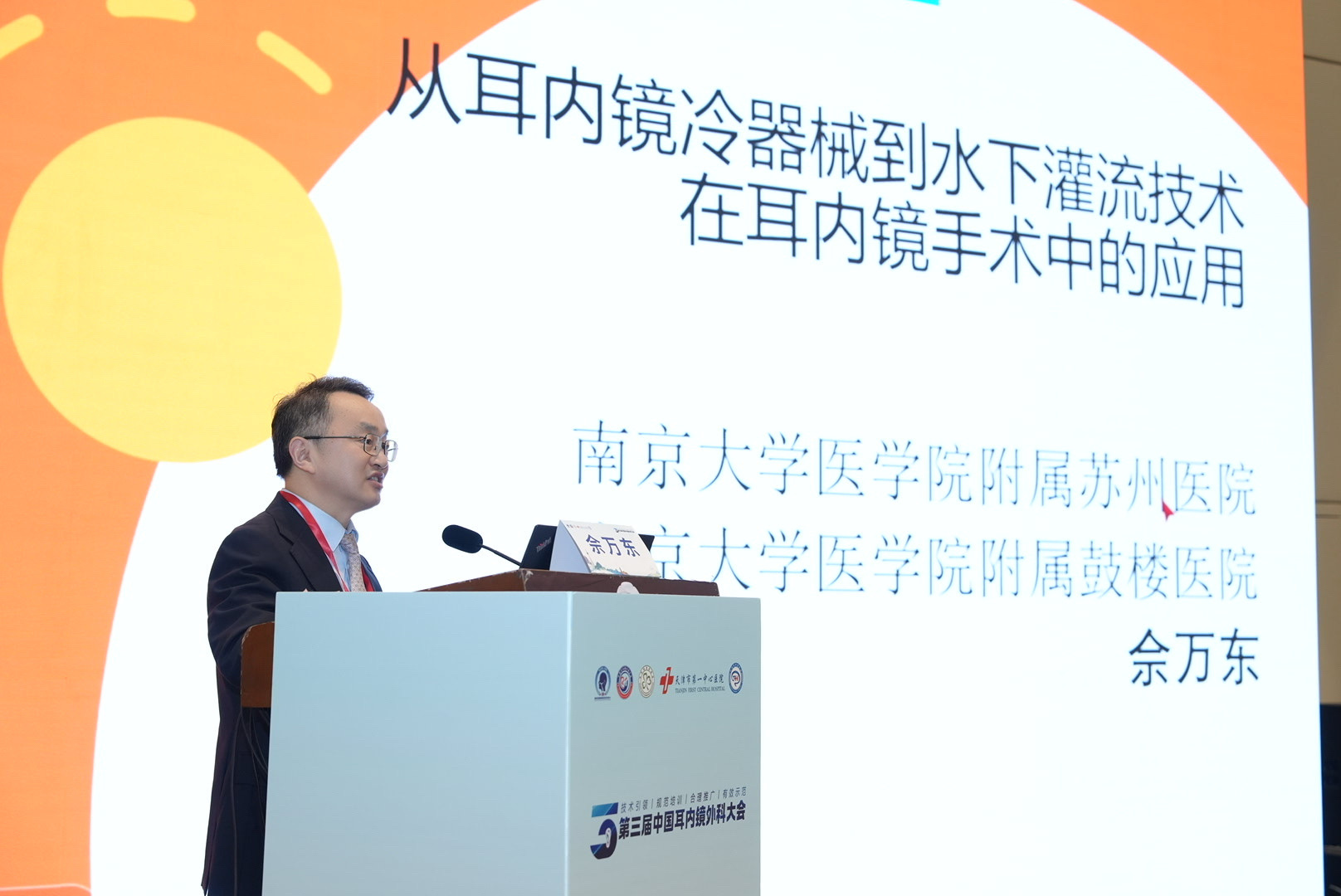 4月18-20日,由國家耳鼻咽喉臨床醫學研究中心等單位在天津舉辦的第三屆中國耳內鏡外科大會上,南京大學醫學院附屬蘇州醫院耳鼻喉科學科帶頭人、南京鼓樓醫院耳鼻喉科原行政副主任佘萬東教授作為江蘇僅有的2位受邀專家為大會作題為《從耳內鏡冷器械到水下灌流技術在耳內鏡手術中的應用》的專題報告,佘萬東還應邀擔任了大會分組會議主持和耳內鏡手術視頻大賽評委等任務。