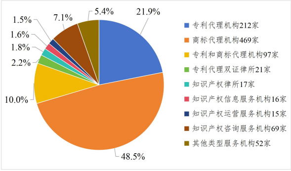業務種類方面,704家機構開展代理服務,81家提供項目咨詢,40家提供法律服務,26家信息服務,21家運營服務,另有1家從事培訓,94家覆蓋其他細分服務。超過80%的機構能夠滿足客戶專利、商標、版權及咨詢等多重需求,推動“一站式”知識產權解決方案不斷普及。