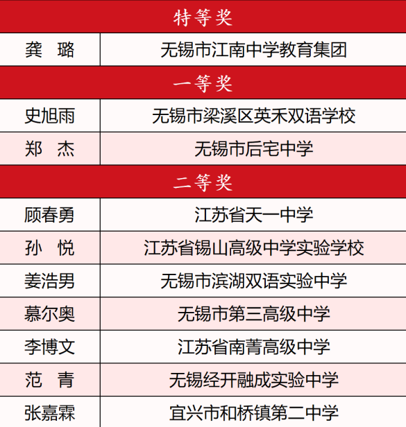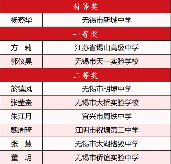 經過評委打分宜興市實驗小學史冰清無錫市江南中學教育集團龔璐無錫市新城中學楊燕華江蘇省錫山高級中學徐彤無錫市輔仁高級中學曾慶紅5位教師憑借出色表現榮獲各組別特等獎。