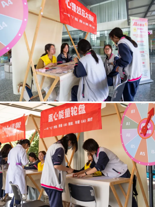 學校舉辦“心市集”AI互動體驗活動?!癘H卡心靈探秘”環節運用AI提問技術解讀OH卡意象,幫助同學們挖掘潛意識;“心理效應大揭秘”環節鍛煉了同學們借助AI快速獲取知識的能力;“醫心能量輪盤”環節則巧妙融合醫療場景與心理調適策略,幫助同學們發展實用型應對技能。