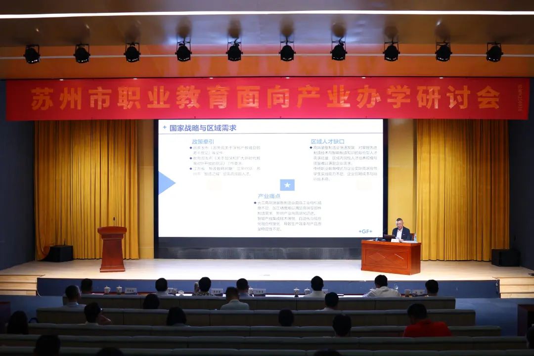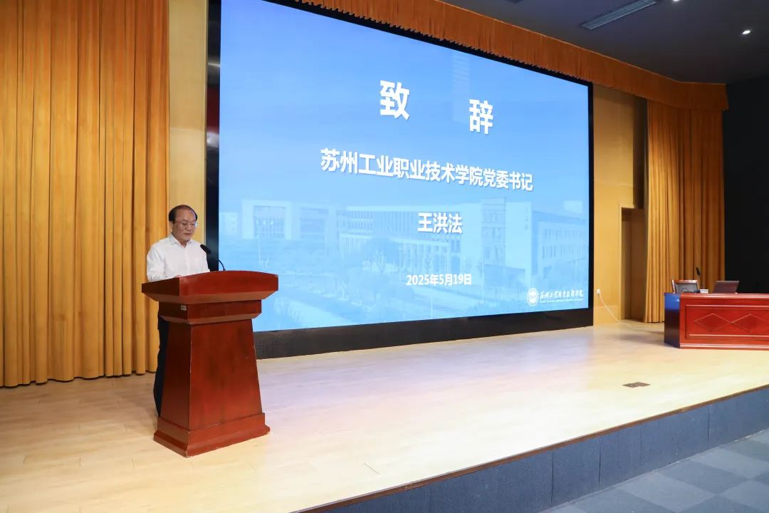 蘇州工業職業技術學院黨委書記王洪法代表學校致歡迎辭。他表示,學校始終圍繞蘇州推進“1030”產業體系構建和新型工業化建設,持續深度推進產教融合、校企合作,適應產業需求,優化專業設置,創新智慧工匠人才培養模式,形成了“專業鏈對接產業鏈、課程鏈對接崗位鏈、人才鏈服務創新鏈”的人才培養特色,為區域經濟社會高質量發展培養高素質技術技能人才。
