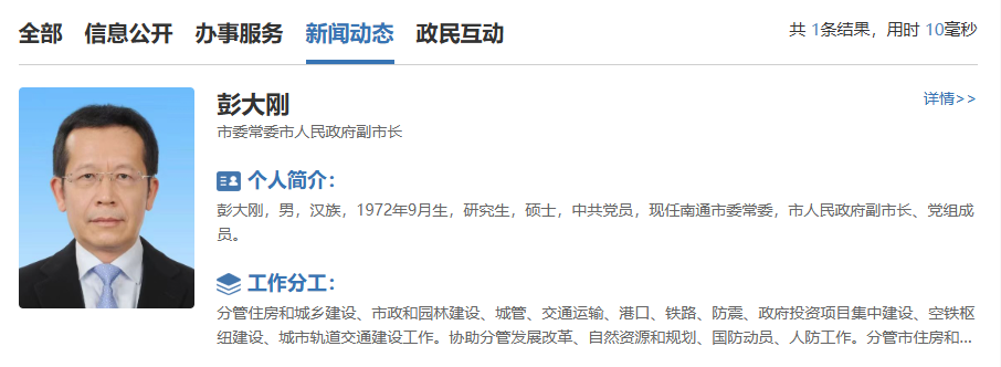 近日,南通市政府官網顯示,彭大剛已任南通市委常委、副市長。