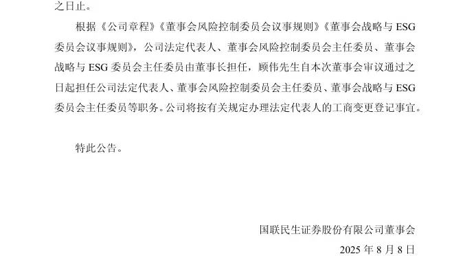 8月8日晚間,國聯民生公告稱,葛小波在辭去董事長一職后,繼續擔任總裁。公司董事會同意選舉現任黨委書記、董事顧偉擔任公司董事長。