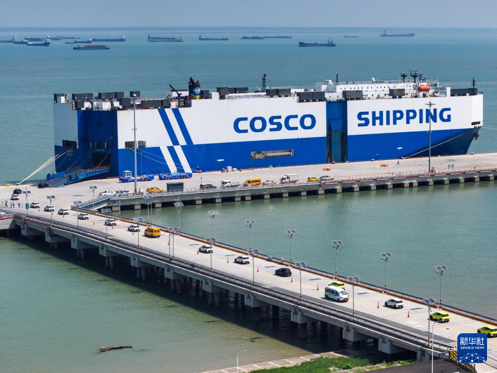 9月16日,在江蘇太倉港,國產汽車有序登船,裝載3600余輛商品車的“玉衡先鋒”號即將啟程前往東南亞(無人機照片)。