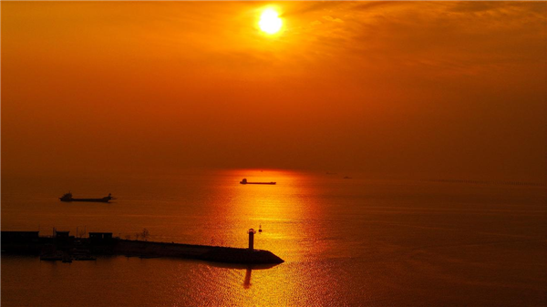 日落時分,港區西連島堤頭燈塔與彩繪防波堤交相輝映,海面被余暉染成金色,歸港漁船緩緩搖曳。游客在燈塔、彩繪堤壩和主題墻繪前駐足拍照,這里逐步成為游客熱衷的“藍色打卡地”。