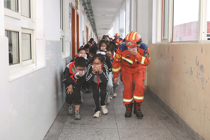 10月13日,淮安市洪澤第二實驗小學聯合區消防救援大隊開展“國際減災日”主題教育活動。圖為消防員和學生正在進行火災逃生演練。 殷潮 攝 (視覺江蘇網供圖)