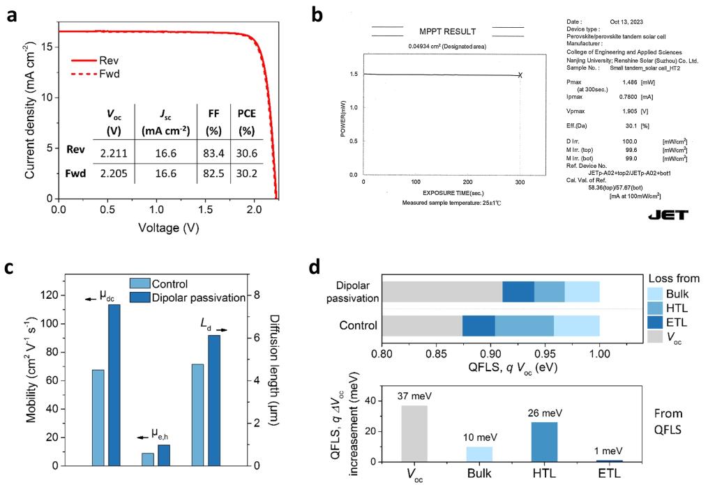 太赫茲輻射探測診斷結果清晰揭示了偶極鈍化策略在促進電荷傳輸、抑制損耗等方面的微觀機制。實驗數據顯示,經鈍化處理的鈣鈦礦薄膜,總載流子遷移率提升68%以上,載流子擴散長度延長近30%。