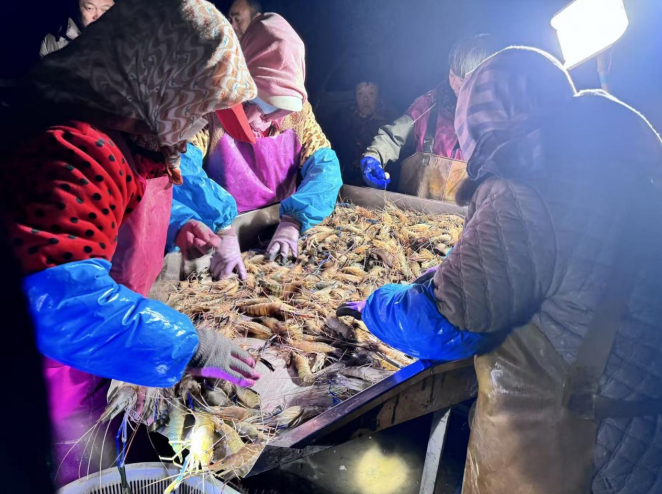 夜幕降臨,華燈初上,在鹽城市射陽縣臨海鎮渠西村,當大多數村莊已歸于寧靜時,這里卻上演著一幕幕熱火朝天的“夜間經濟”圖景。渠西村水面養殖面積達2300畝,全村有110多戶村民從事水產養殖工作。老百姓利用夜晚時分拉網捕撈羅氏蝦,岸邊等候的收購商正忙著驗貨、稱重、裝箱。這一“晚上拉網、直接出售給收購商”的產銷新模式,正讓渠西村的羅氏蝦以最新鮮的狀態直通市場,為村民增收注入了強勁動力。