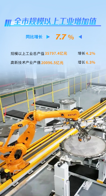 前三季度,全市規模以上工業總產值35797.4億元,同比增長4.2%。規模以上工業增加值同比增長7.7%。重點行業有力支撐。全市工業行業產值增長面達73.5%,其中電子信息業產值同比增長6.1%,電氣機械和器材制造業產值增長5.0%,兩大行業合計拉動規模以上工業總產值增長2.2個百分點。產業向新向優發展。前三季度全市規模以上高新技術產業產值20096.5億元,同比增長6.3%;高新技術產業產值占規模以上工業總產值比重達56.1%,同比提高1.5個百分點。高新產品產量快速增長。光電子器件、工業機器人、鋰離子電池等產品產量分別增長10.0%、20.6%和55.9%。