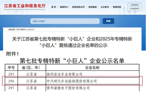 近日,江蘇省工業和信息化廳公示第七批專精特新“小巨人”企業名單,中汽研汽車試驗場股份有限公司憑借在汽車試驗場領域突出的自主創新能力和核心競爭力成功上榜。