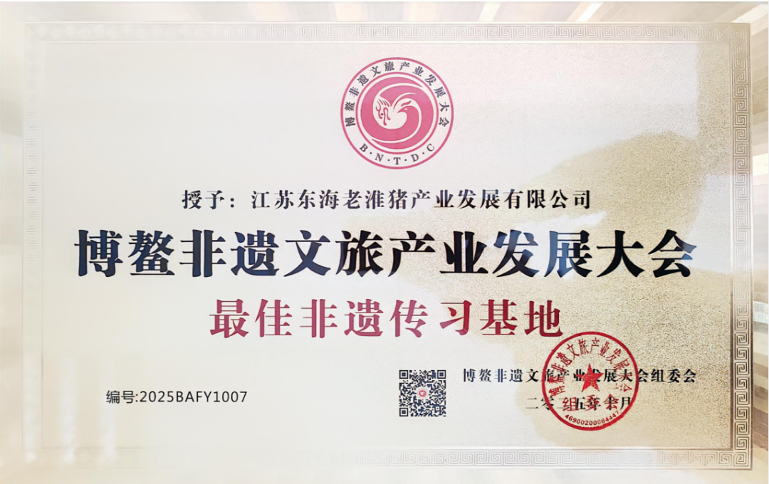 在2025博鰲非遺文旅產業發展大會的頒獎典禮上,東海老淮豬非遺項目成為最大贏家。經過激烈角逐和嚴格評審,東海老淮豬從全國數百個候選單位中脫穎而出,榮獲“最佳非遺傳習基地”稱號。