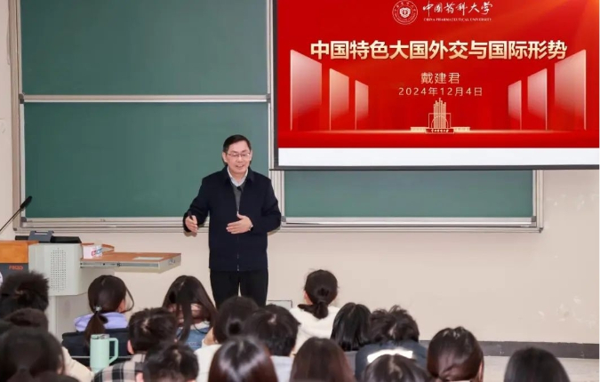 2024年12月4日,冬日暖陽透過玻璃窗灑進階梯教室,校黨委書記戴建君站在講臺前,手指輕點屏幕,引出一個問題:“同學們,你們知道什么是外交嗎?”這堂面向藥學新生的《形勢與政策》課,就這樣從一個看似簡單的問題開始。
